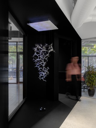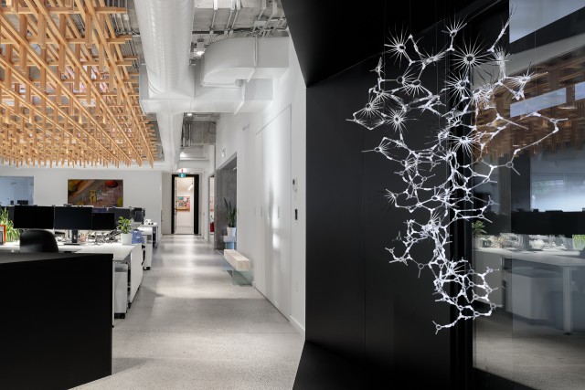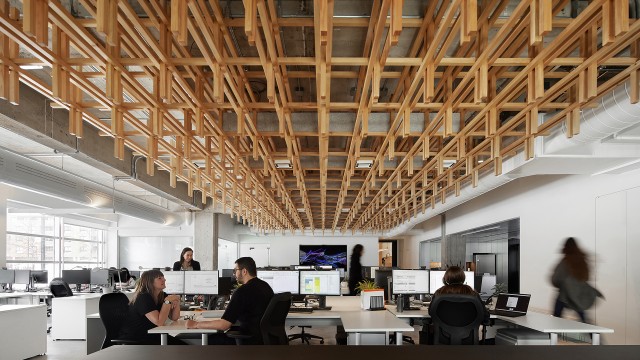 The layout of a large open area on the ground floor offers multiple possibilities. Serving both as a flexible workspace and a gathering place, it features mobile unassigned workstations and a garage door for hosting events. A signature element, the wooden ceiling structure brings the space to life and suggests a focal point for gatherings. In addition to its acoustic properties and integration of lighting fixtures, it creates a warm and calming atmosphere. Echoing the firm’s identity program through its orthogonal grid and to the structure of the extension with its use of wood, its assembly details are also reminiscent of furniture designed and manufactured in-house several decades ago.