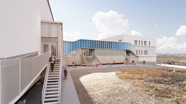 La firme œuvre à la conception d’une nouvelle école primaire et secondaire à Quaqtaq depuis la fin de l’année 2023, en consortium avec MLS Architectes et en collaboration avec Kativik llisarniliriniq. Inspiré d’un oumiak voguant sur les flots — ou umiak, grande embarcation inuit traditionnelle, faite de peaux tendues sur une ossature en bois, utilisée pour le transport et la chasse —, les volumes de l’école sont tout en courbes et en fluidité. Le nouveau bâtiment accueillera des élèves du primaire et du secondaire, chacun disposant d’une entrée distincte et de parcours séparés. Le feu vert a été donné pour la construction de ce projet important pour la communauté de Quaqtaq, qui débutera en juillet.