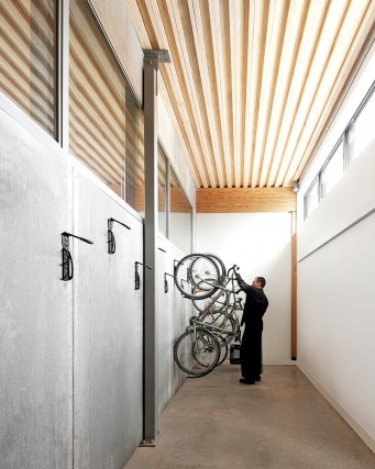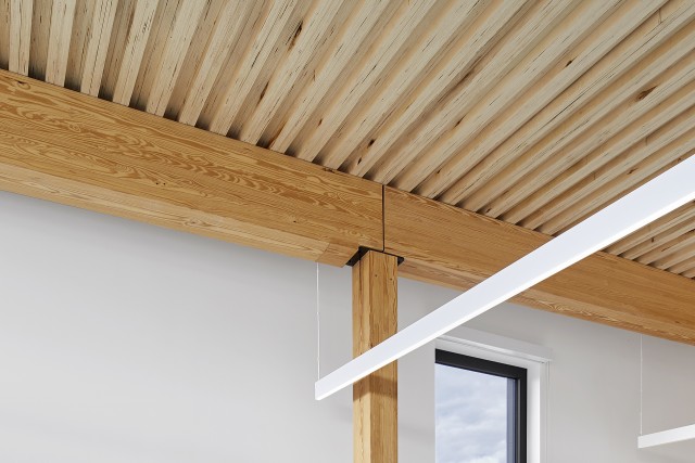 À ce système principal s’ajoutent une dalle de béton sur le sol au rez-de-chaussée, une structure d’acier (pontage et colonnes) au 2e étage afin de soutenir le porte-à-faux, un contreventement en bois lamellé-croisé pour la cage d’escalier et un contreventement d’acier à l’arrière du bâtiment.