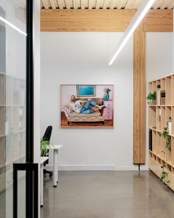 En réponse à la forte croissance de notre équipe, un agrandissement de 516 m² à nos bureaux a été construit vers l'est sur la rue Rachel afin de bonifier nos espaces avec l’ajout de plusieurs postes de travail, d’une aire de repas spacieuse avec une cuisine et un comptoir café, d’une grande salle multifonctionnelle pourvue d’une cloison de verre rétractable, un toit-terrasse, un espace intérieur pour le rangement et la réparation des vélos et une douche pour nos cyclistes. Offrir un environnement de travail agréable et propice à la créativité et au bien-être du personnel était primordial, ainsi que privilégier des matériaux naturels, des couleurs sobres et des aménagements épurés mettant en valeur la structure exposée de l’existant. Ce fût également l’occasion de repenser l’espace en fonction des nouveaux besoins de l’équipe et de le décloisonner davantage afin d’acheminer un maximum de lumière naturelle. C’est ainsi que le projet s’est poursuivi avec le réaménagement intérieur des trois étages du corps de bâtiment principal ― un bâtiment industriel situé en face des anciens ateliers Angus.