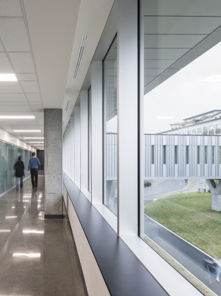 Trois des quatre étages du pavillon sont consacrés à la recherche et ils comportent des thématiques particulières. Le deuxième niveau abrite le numérique de la santé, alors que les troisième et quatrième niveaux hébergent de grands laboratoires où les chercheurs travaillent respectivement sur le vieillissement et les neurosciences, et les infections et l’inflammation. Les laboratoires secs et humides sont modulaires et ont été superposés à travers les étages afin d’optimiser la distribution des services électromécaniques.